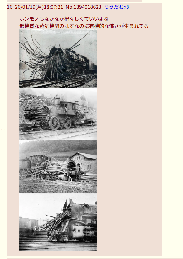 | … | 4126/01/20(火)23:50:07No.1394428424+理解するには普段から蒸気機関車に対してよくない目で見てるぐらいのベースラインが必要だと思う |