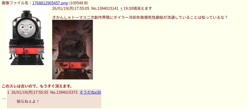| … | 2826/01/20(火)23:29:44No.1394421694+>何って…きかんしゃトーマスがボイラー冷却できなくて爆死する性癖だが? |