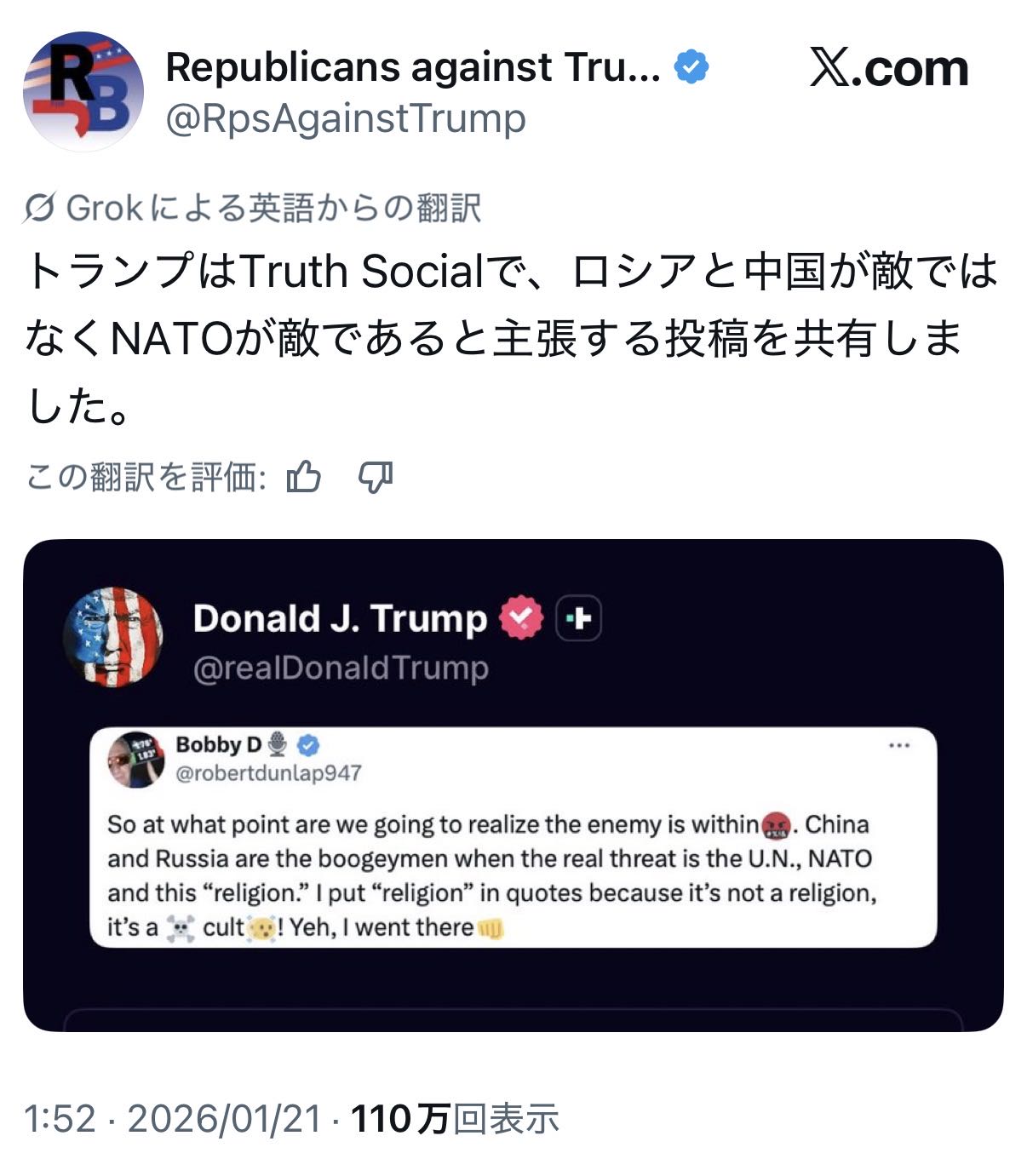 | … | 2726/01/21(水)10:41:47No.1394495060+中露と価値観を共にするトランプにとって西側の歪んだ価値観こそ敵 |