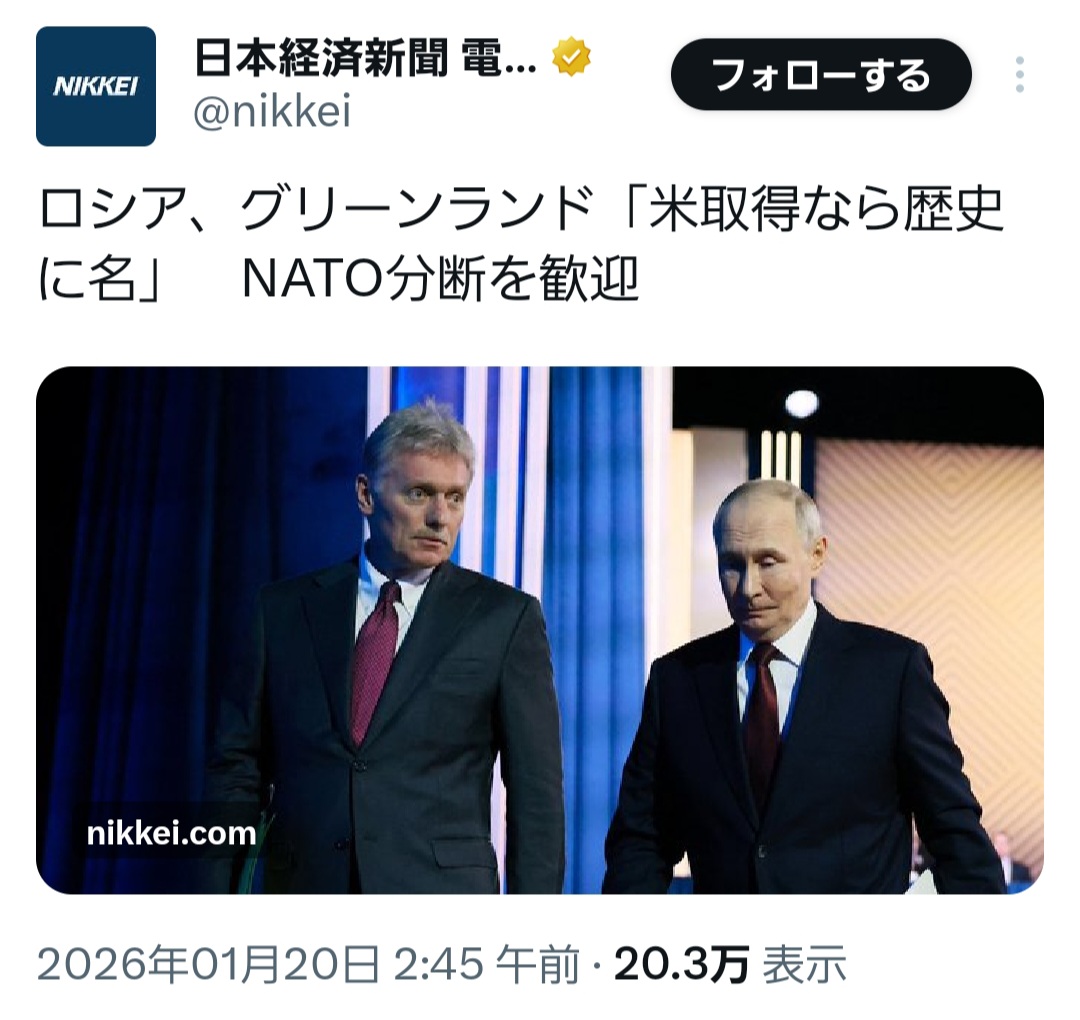 | … | 4526/01/21(水)10:49:46No.1394496304そうだねx1グリーンランドは中国云々より資源欲しいだけだろ |