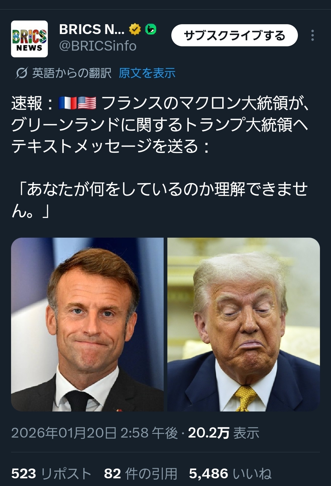 | … | 18326/01/21(水)12:32:20No.1394518302そうだねx1>>米露のボケ老人をマクロンが介護してる |