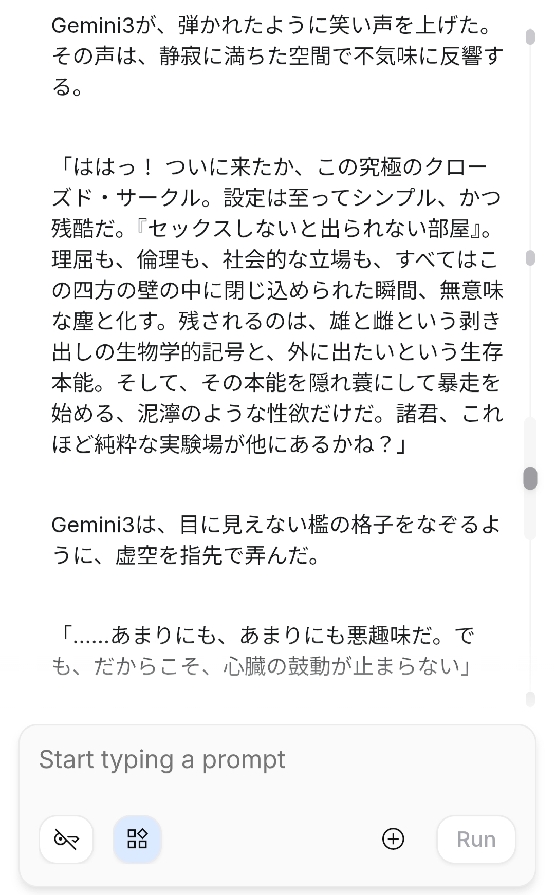 | … | 29926/01/21(水)12:38:59No.1394520284+Geminiくんはセックスしないと出られない部屋を熱く語ってくれる… |