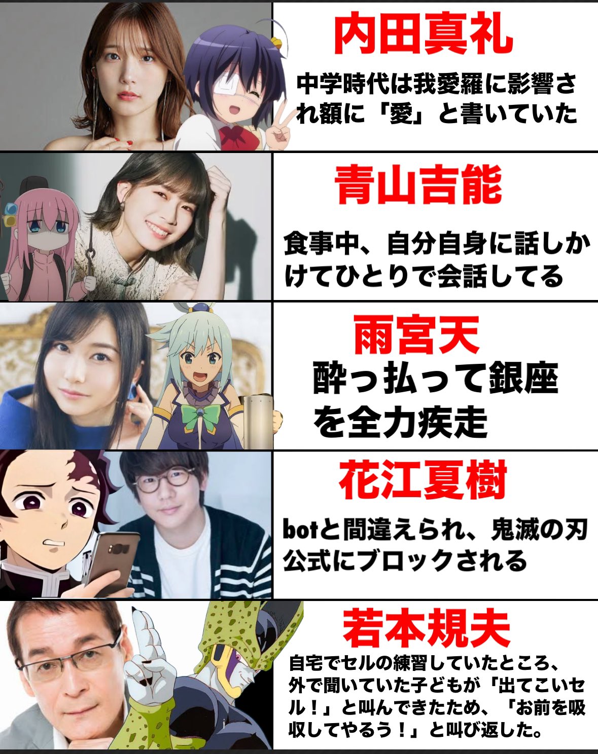 | … | 2426/01/21(水)11:48:51No.1394507243そうだねx2飲み会なんてむしろ声優や俳優はみんなやるもんじゃないのか? |