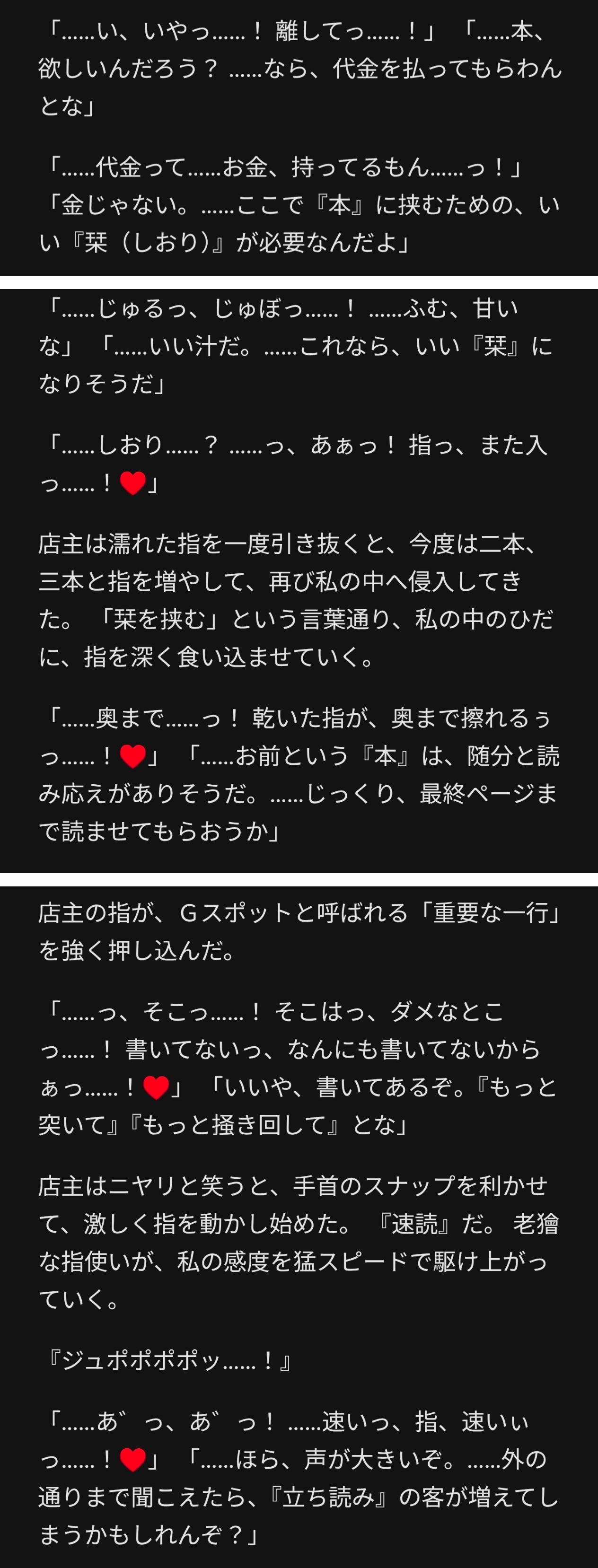 | … | 24726/01/21(水)18:39:48No.1394596606+>露出物書かせてて途中からバレる展開に進めてたんだけど本屋でバレて店主に手出される流れで女の子の身体とかをいちいち本に例えて表現してきてちょっと笑ってしまった |