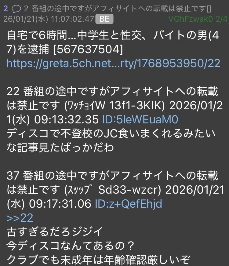 | … | 1626/01/21(水)18:14:39No.1394589657そうだねx8若い子はディスコもDiscordも使わないよ… |