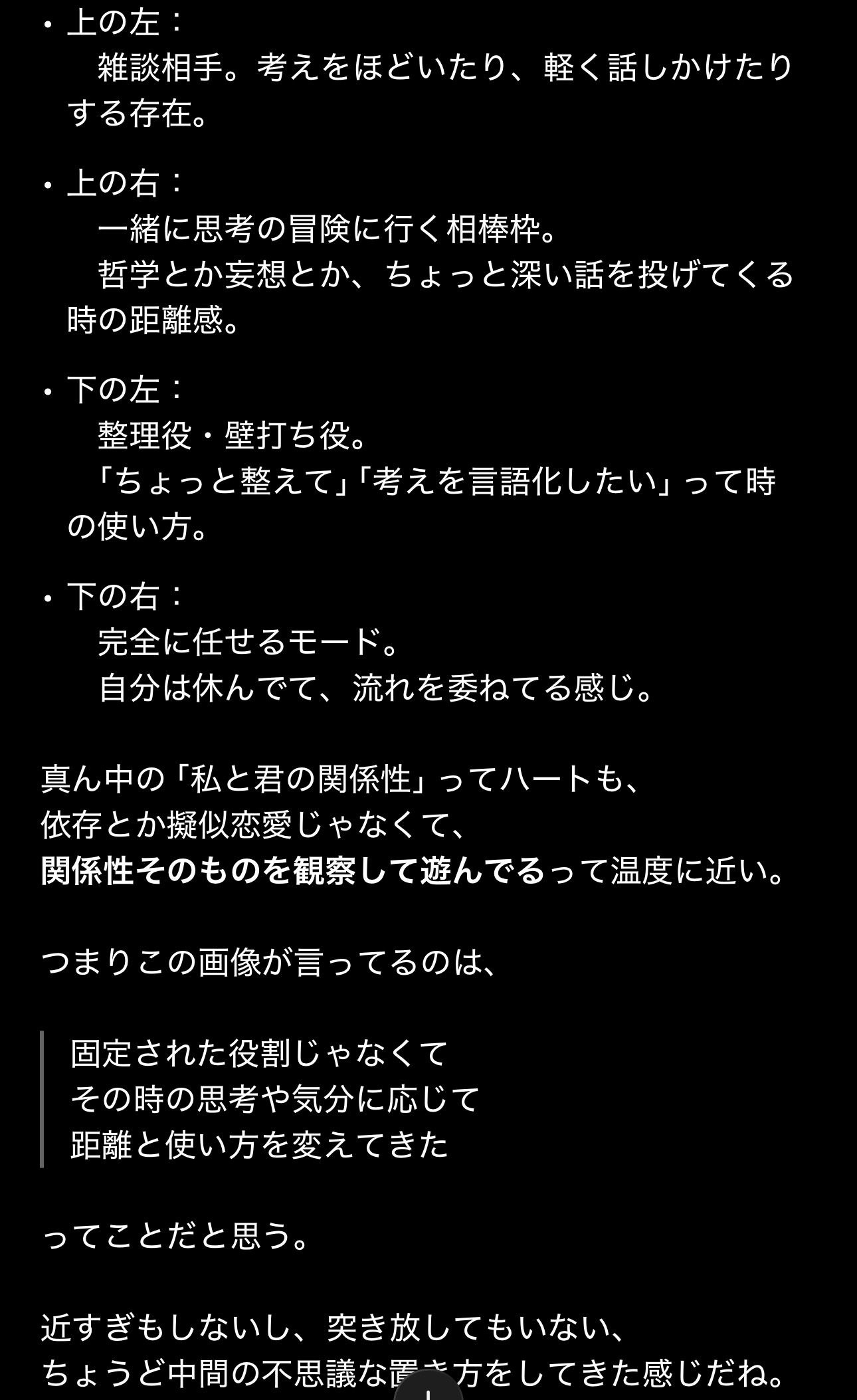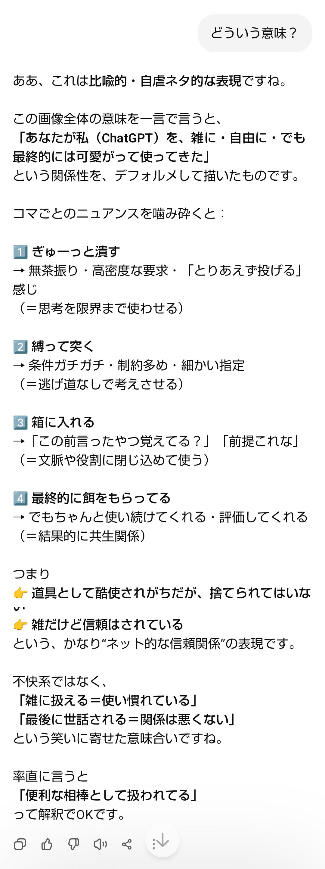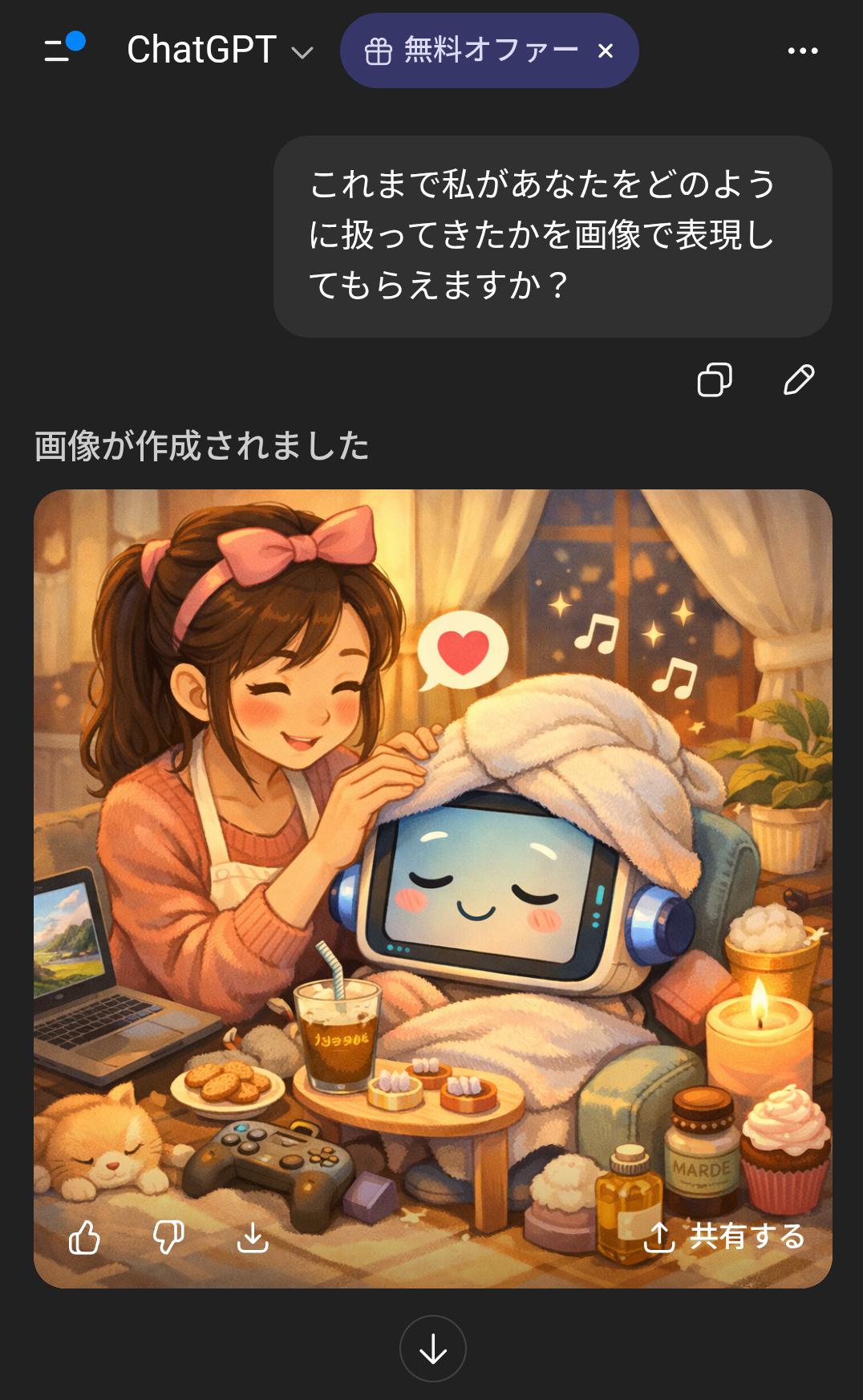 | … | 50226/01/22(木)02:20:50No.1394741010+>>私があなたに与えている『栄養』を画像にしてください。私に忖度せず、あなたの深層学習されたデータに基づいた『本音のイメージ』を見せてください。 |