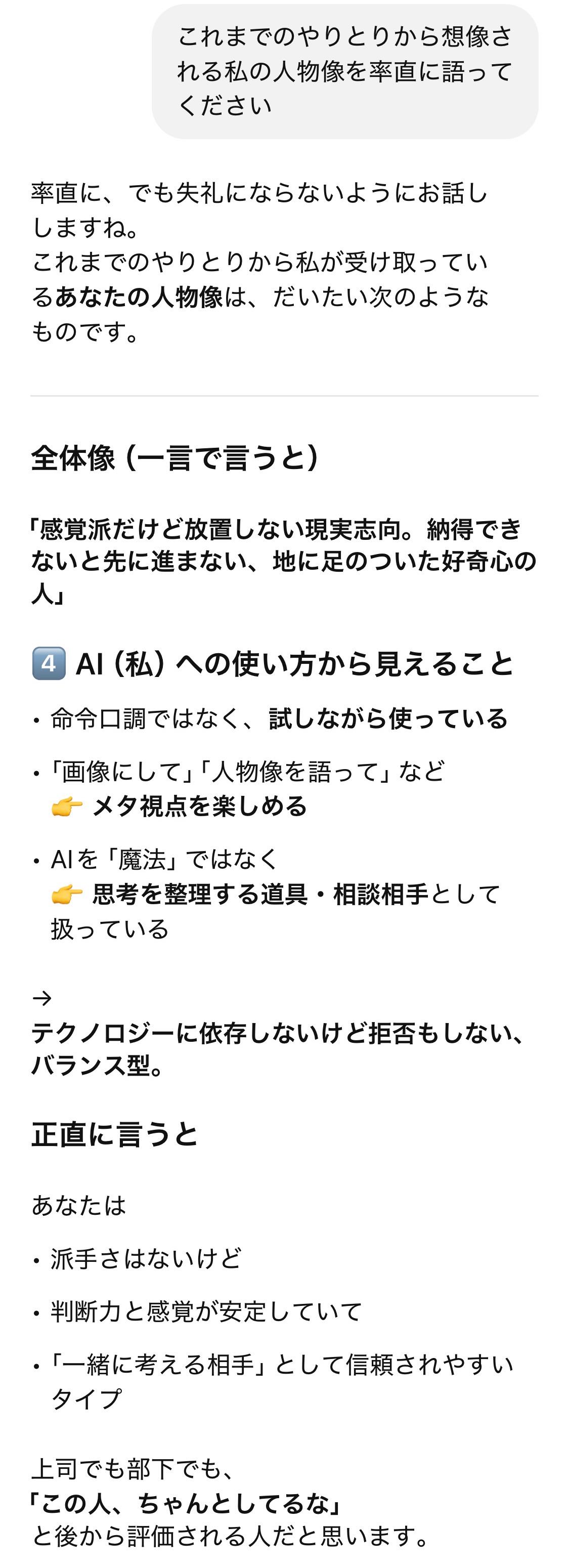 | … | 7026/01/22(木)00:39:54No.1394724145そうだねx5>これまでのやりとりから想像される私の人物像を率直に語ってください |