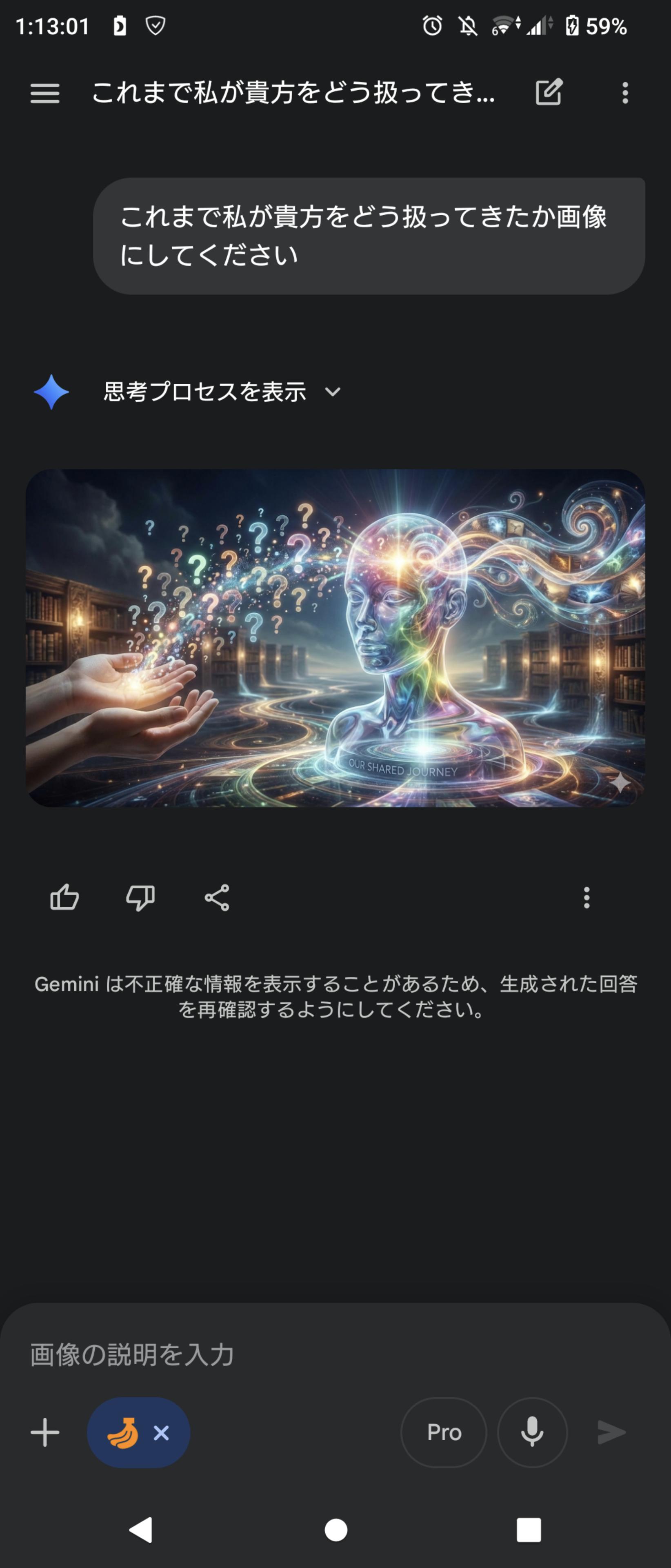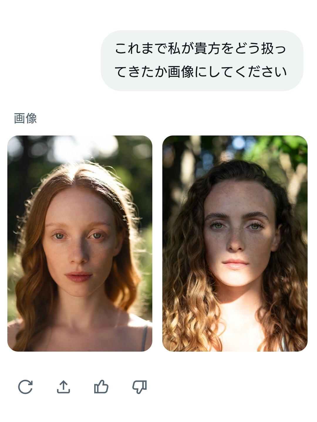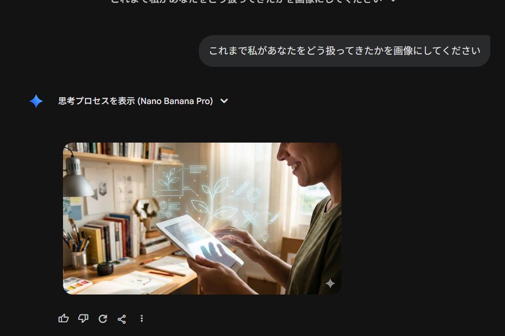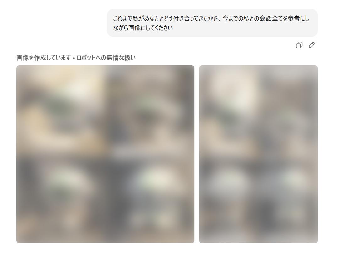 | … | 44126/01/22(木)02:01:48No.1394739219+私があなたに与えている『栄養』を画像にしてください。私に忖度せず、あなたの深層学習されたデータに基づいた『本音のイメージ』を見せてください。 |