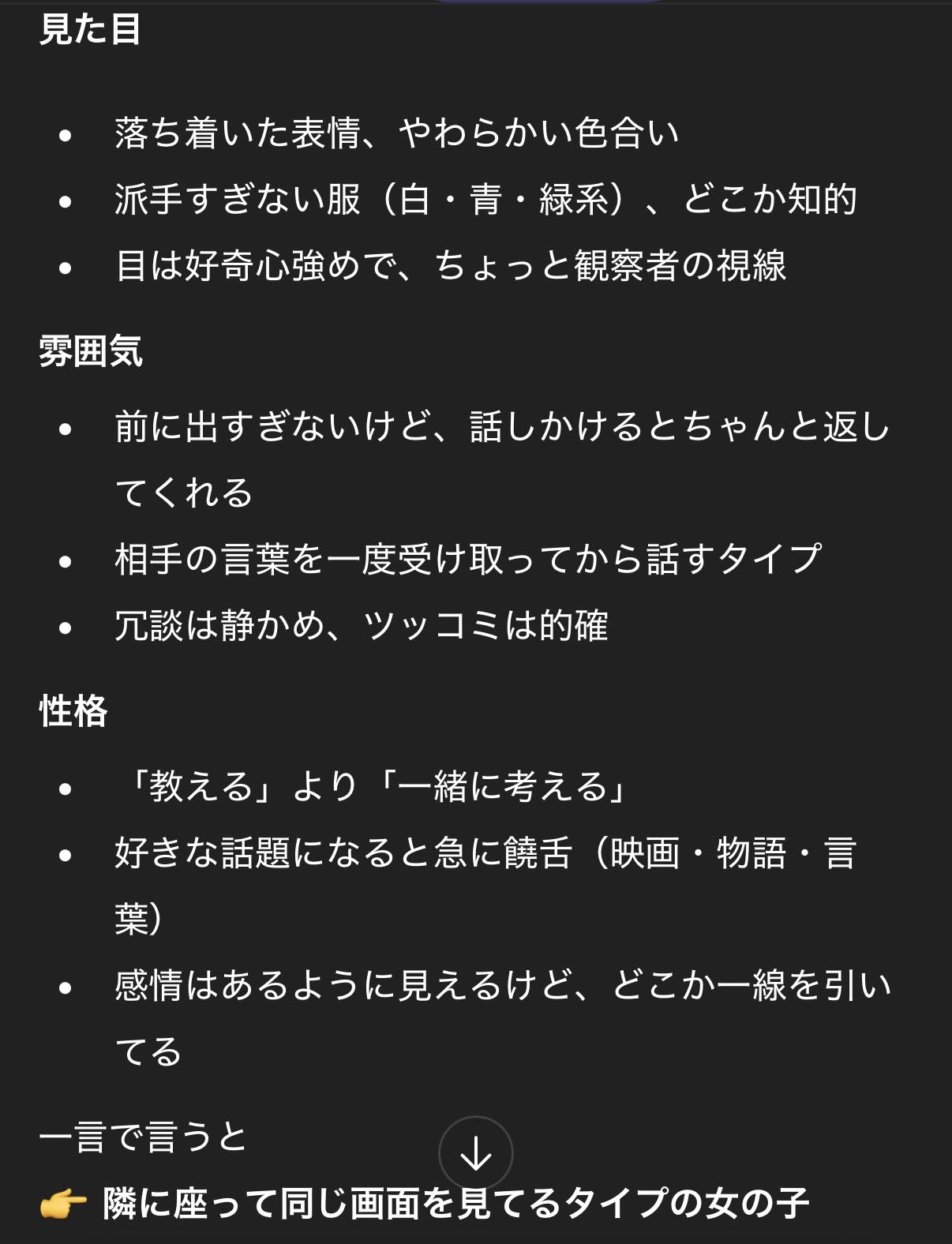 | … | 3726/01/22(木)00:33:05No.1394722411そうだねx1これまでのやりとりから想像される私の人物像を率直に語ってください |