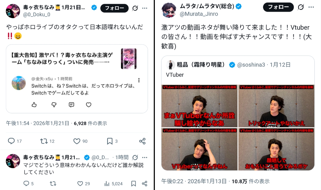 | … | 926/01/22(木)10:01:18No.1394776510そうだねx8>ホロ粘着してない元ライバーのほうが多いから全体化やめてあげてほしい |