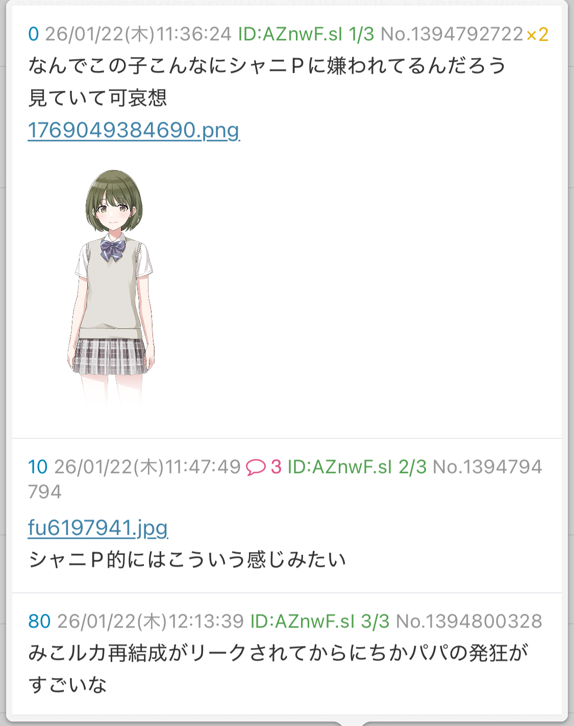 | … | 9826/01/22(木)12:18:50No.1394801781そうだねx6>みこルカ再結成がリークされてからにちかパパの発狂がすごいな |