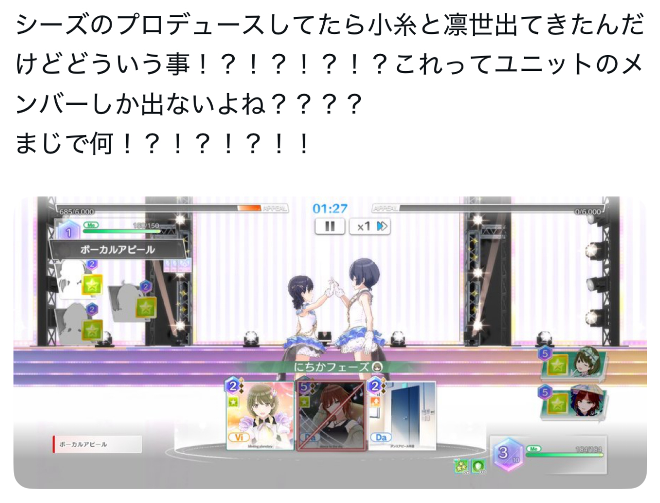 | … | 11026/01/22(木)19:19:24No.1394896183そうだねx2(ビール箱のステージで手を取り合う凛世と小糸の姿を思い出している) |