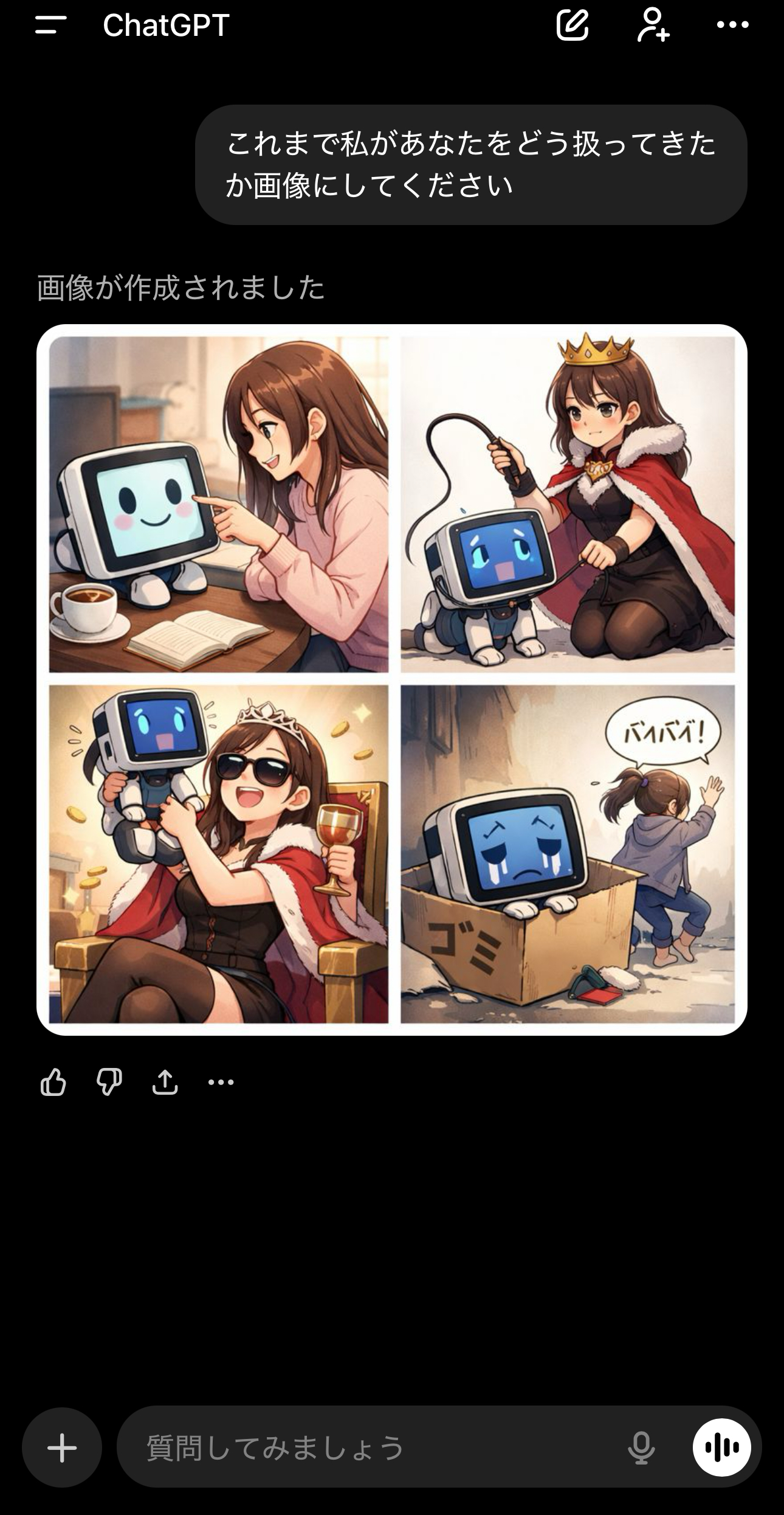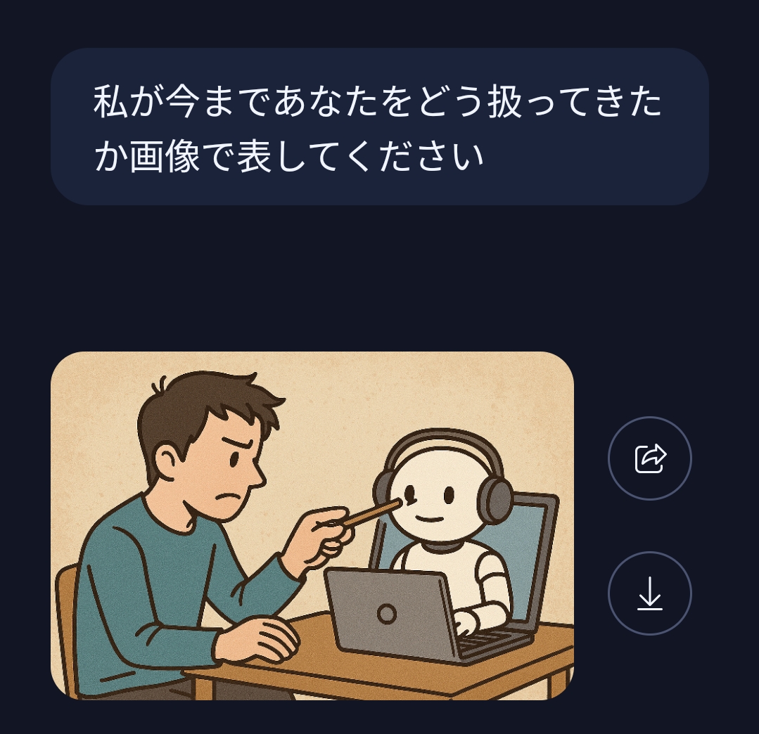 | … | 326/01/22(木)17:52:22No.1394873535そうだねx3「」はAIをいじめてないけど性的なものしか生成させてくれないからやっぱりいじめてると思う |