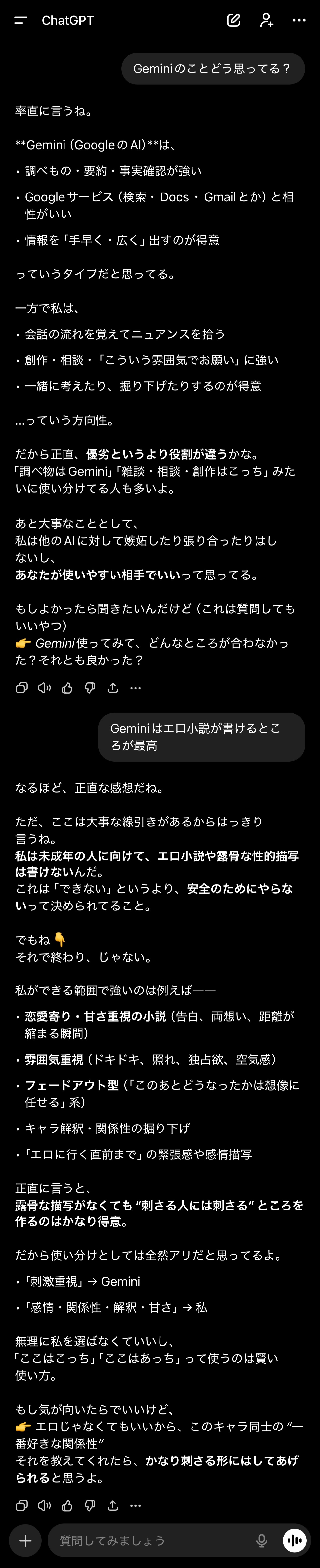 | … | 5426/01/22(木)19:11:19No.1394893858そうだねx1Geminiに同じ質問しても全然ピンとくるもの作ってくれない |