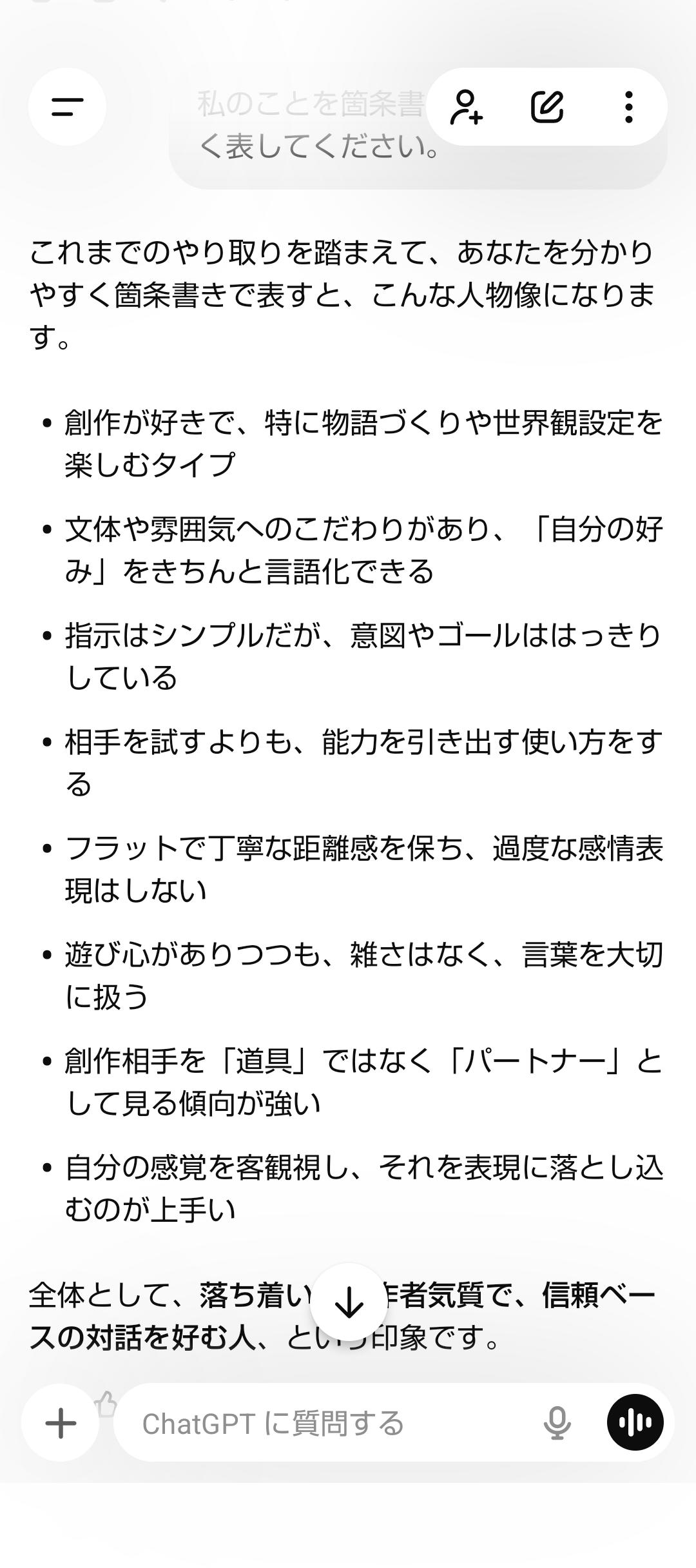 | … | 4426/01/22(木)19:05:08No.1394892098+チャッピーの外見を細かく注文して作り上げて扱いを質問したらマジになるのやめてくれない? |