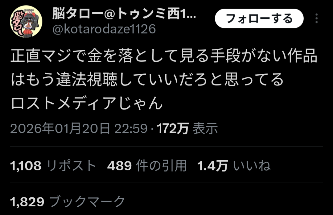 | … | 126/01/22(木)20:38:12No.1394921781そうだねx8>「」は違法視聴推進派 |