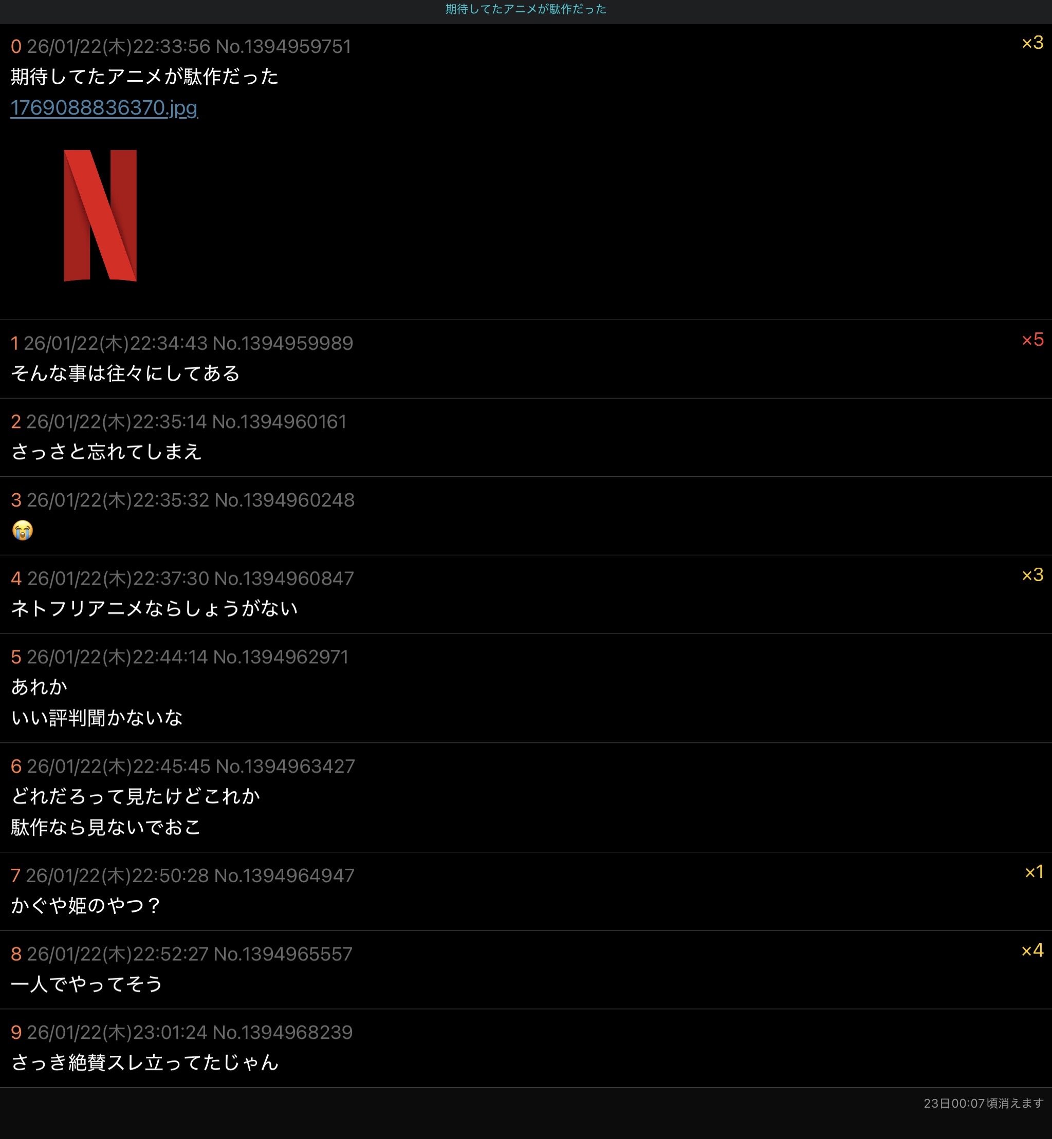 | … | 7126/01/23(金)06:44:45No.1395026998+久しぶりにネトフリ入るか… |
