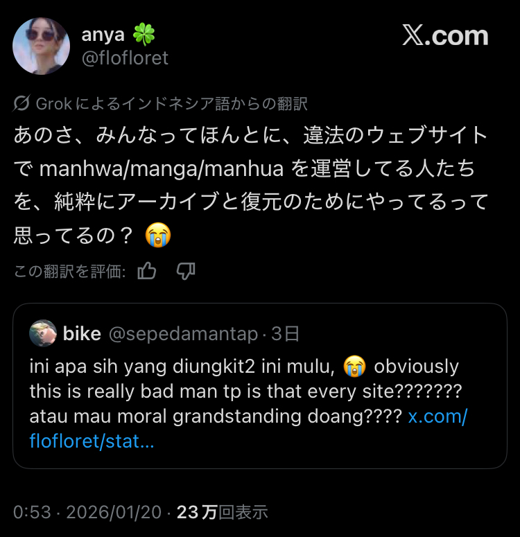| … | 7826/01/23(金)10:58:37No.1395059943+俺は読んでるけど正直人気ないよな…って思ってる漫画がなぜか海外でバズってて(えっ!?翻訳版とか出てたの?)と思ったら案の定ファンサブ翻訳が違法アップされたのが盛り上がりの発端だった |
