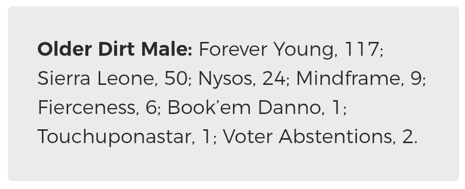 | … | 9226/01/23(金)11:57:05 ID:fTChYIMENo.1395070060そうだねx2Horse of the Year ;Sovereignty, 201; Forever Young, 17; Journalism, 2. |