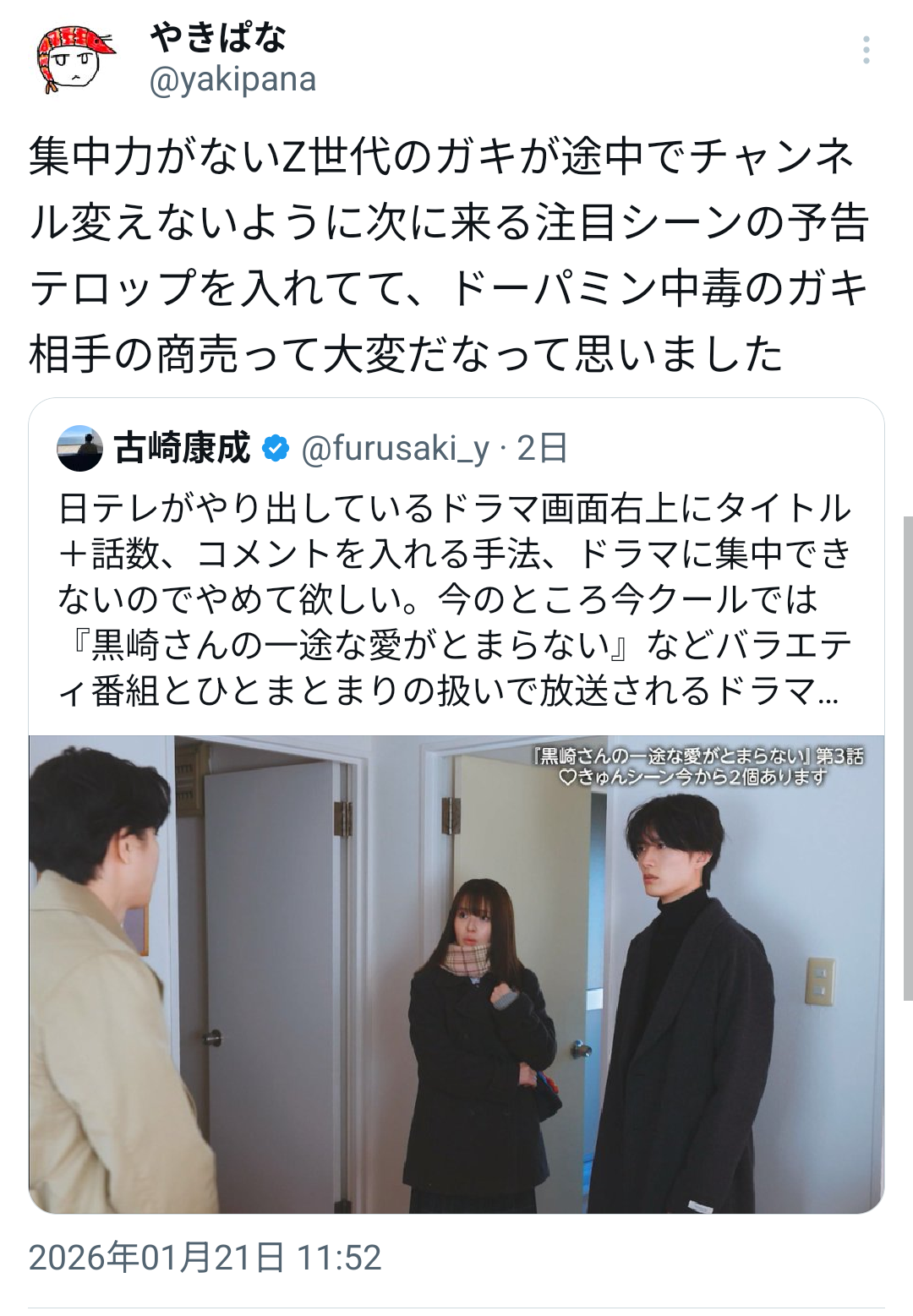 | … | 13026/01/23(金)15:02:25No.1395112046+>こういうのって大半は若者向けじゃなくてドラマを見る集中力もなくした老いぼれのため… |