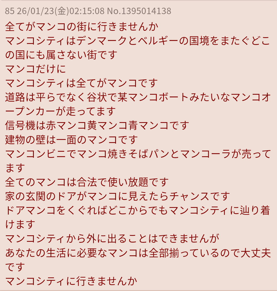 | … | 18826/01/23(金)17:43:42No.1395145573+マンコ。と書き込むたびに、コーラップスピースが、パラデウスに寄付される。 |