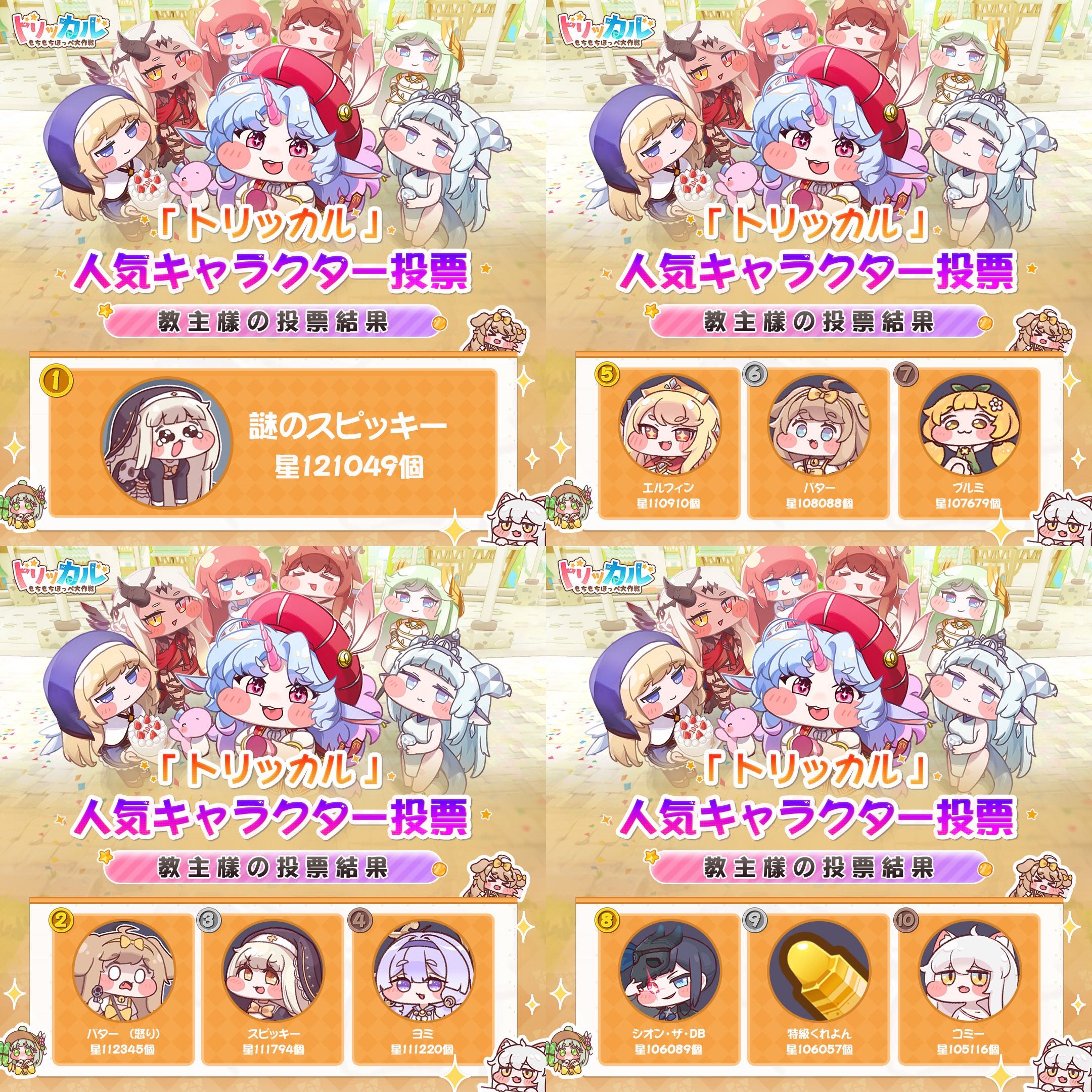 | … | 50926/01/23(金)18:04:53 ID:2A28J.LwNo.1395151035+人気投票1位〜10位のキャラクターでイベストとかつくるにゃん? |