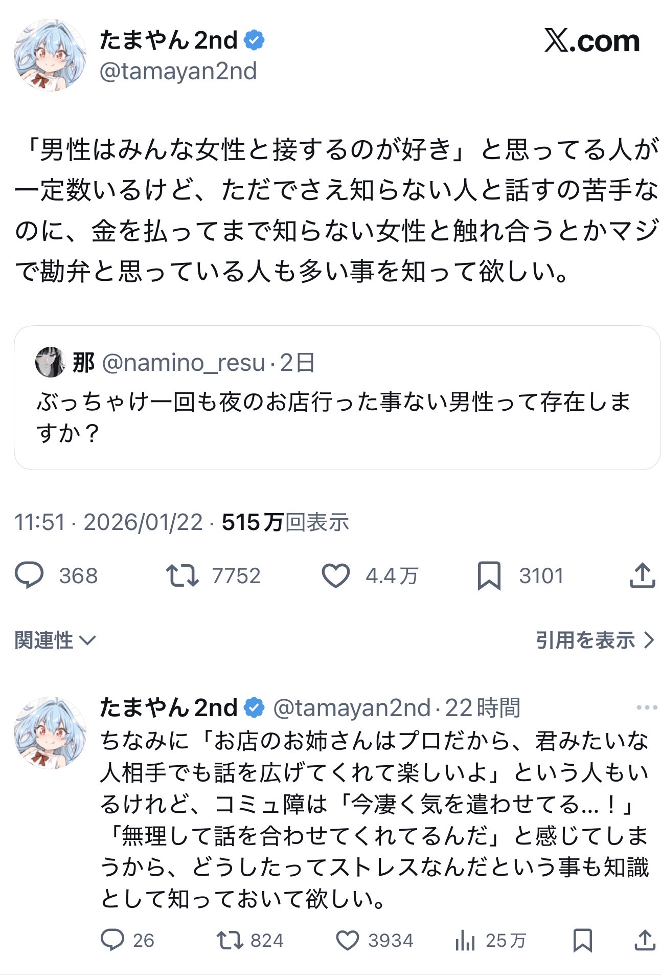 | … | 5226/01/23(金)17:15:19No.1395138907+>わざわざ2つもアカウント作ってまで発信したいことはあるのに会話は嫌いなんだね |