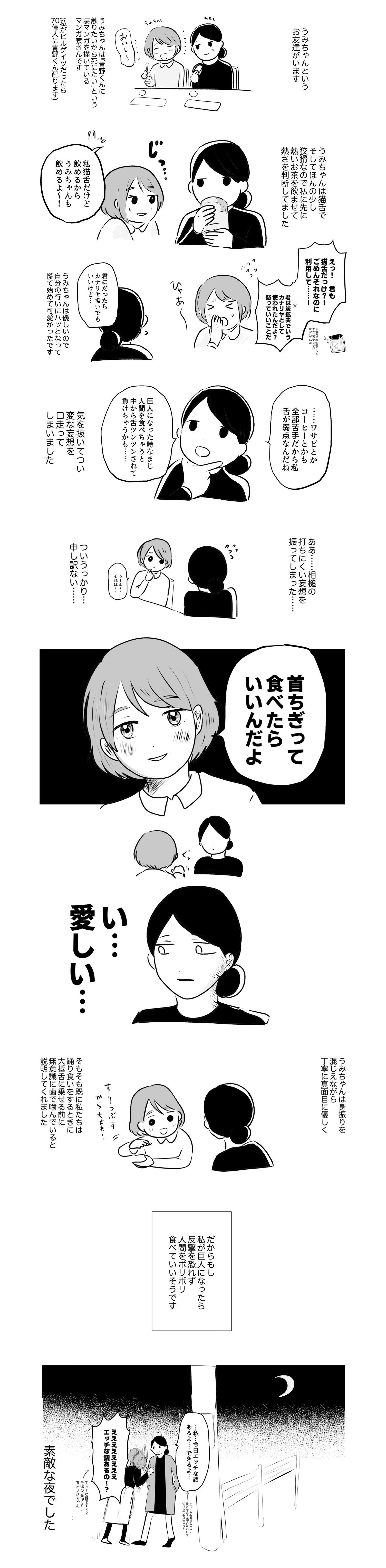 | … | 23026/01/23(金)17:32:43No.1395142876そうだねx2青野くんは初連載だったんですけど、自分が「これだ!」って思う好きなことを描いたらきっと読者の人も楽しんでくれるんじゃないかなって思って「大好きな擬似セックスをいっぱい描きます!」って担当さんに伝えて連載が始まりました 擬似セックスとは、性行為に該当しない性行為の模倣のことです |