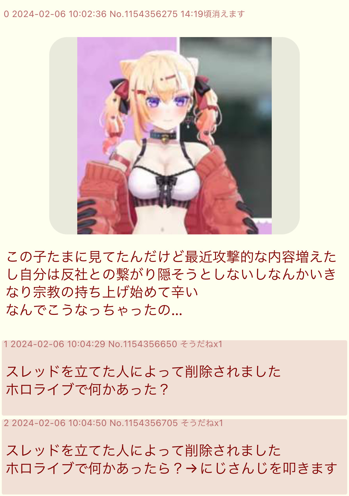 | … | 2026/01/23(金)19:25:51No.1395176452そうだねx10別ににじ大して粘着されてないでしょ |