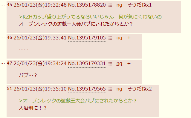 | … | 5126/01/23(金)19:35:10No.1395179565そうだねx2>オープンレックの遊戯王大会バブにされたからとか? |
