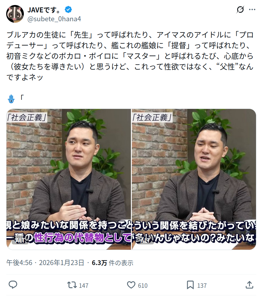 | … | 926/01/23(金)20:54:43No.1395208988そうだねx4>父性を持ちながらちんぽ勃ててたら余計にキショくないですか? |
