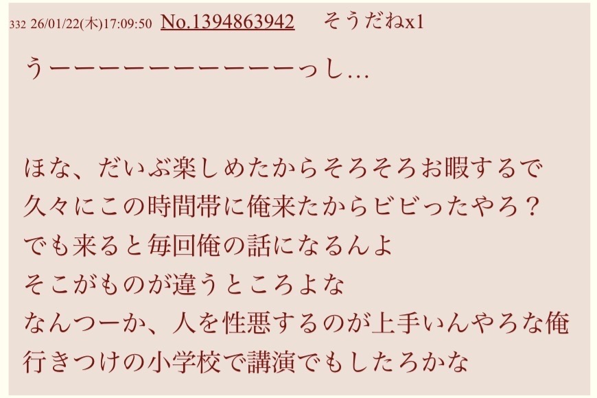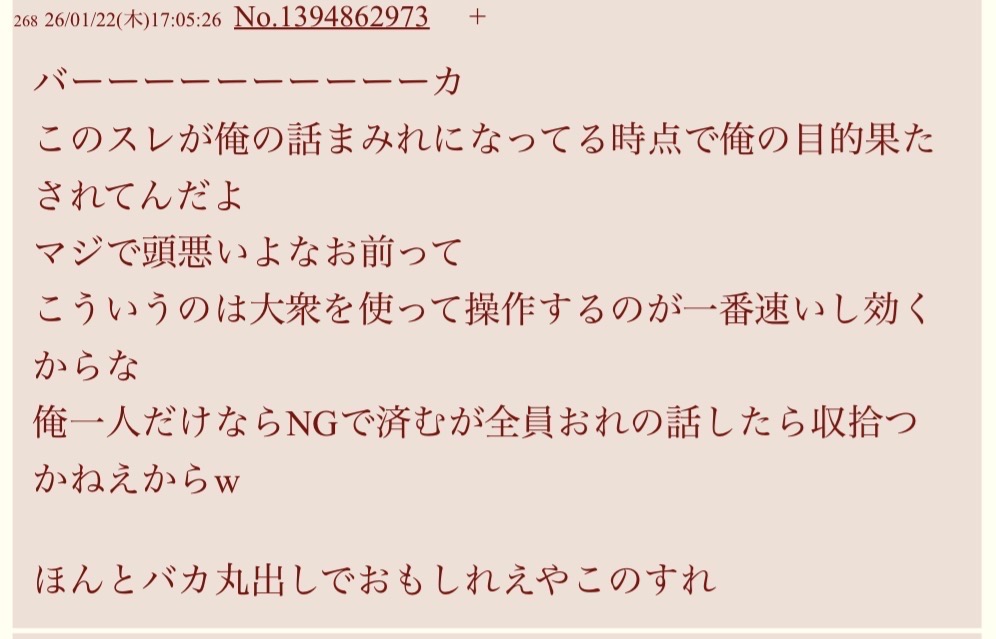 | … | 21826/01/23(金)23:24:01No.1395270631+自分でいくらそうだね盛ってもウンコの臭いは消臭できないぞ |