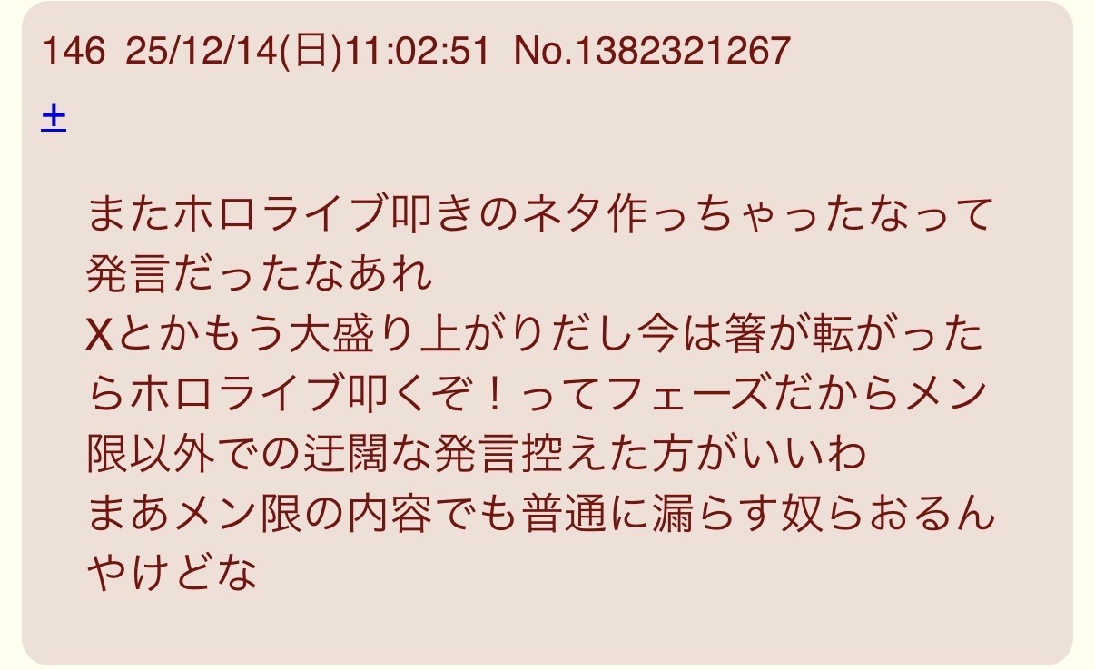 | … | 21126/01/23(金)23:23:18No.1395270349そうだねx2開示にビビって直球のホロ粘着出来なくなってんのな |