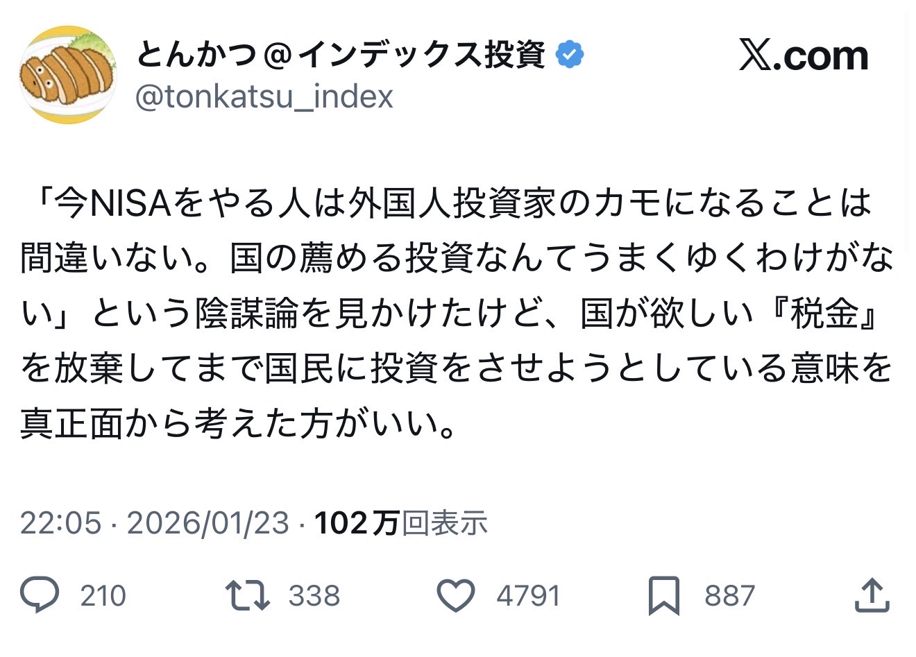 | … | 1926/01/24(土)11:21:31No.1395361225そうだねx1なんか異様にNISA敵意持ってる人いるけどただ一定額まで非課税になるってだけの制度なのにな |