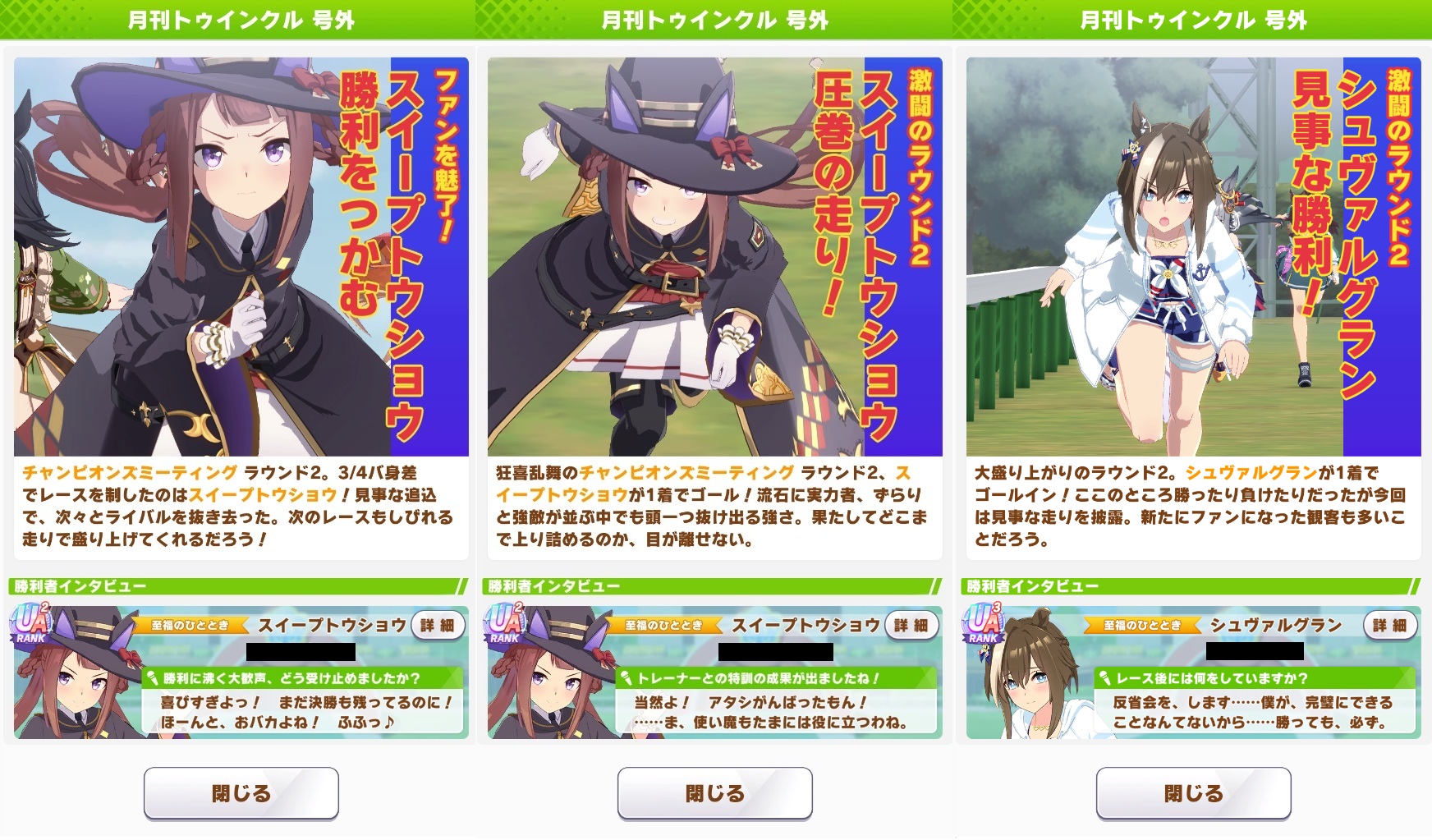 | … | 41526/01/24(土)13:40:00No.1395395076+勝つこと自体が目的なんじゃなくて勝った時のもらえるSPが高いからクロノちゃんは勝つ意味があるのだ |