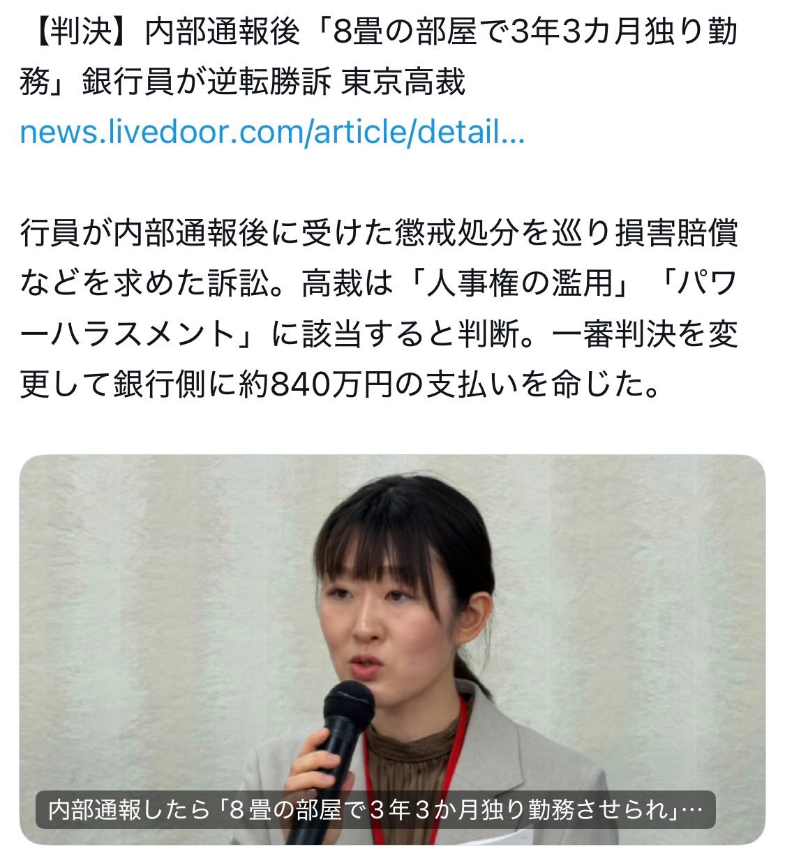 | … | 726/01/24(土)13:50:05No.1395397472そうだねx19>一審ではAさんの業務環境について、銀行による「大きな窓があり外の景色が見える。冷暖房が完備されている。他の行員の執務室よりも良く、極めて快適かつ開放的な環境である」との主張が認められた。 |
