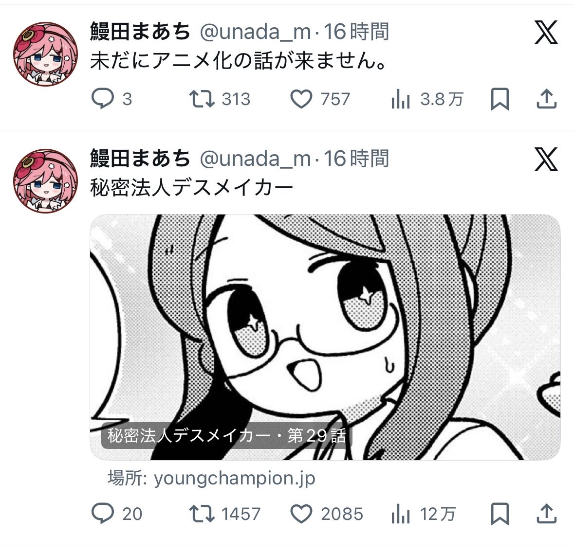 | … | 25826/01/24(土)18:14:30No.1395463163+>チャンピオンは結構アニメ化してるほうやろ |