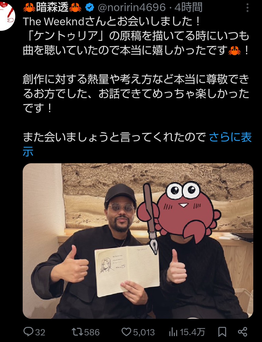 世界的シンガーweekndさん日本のまだヒットしてないマイナー漫画にどハマりして作者に会いに行くこのスレは古いので、もうすぐ消えます。