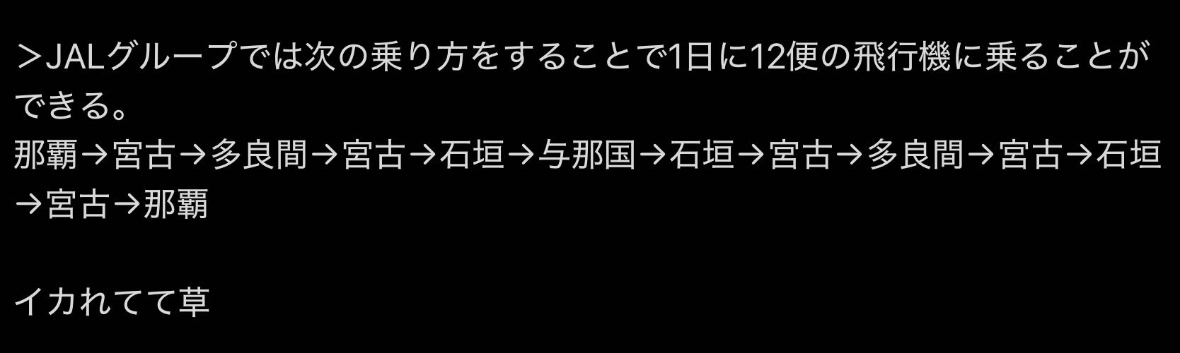 | … | 21126/01/24(土)21:09:12No.1395523832そうだねx2めちゃくちゃ簡単な解決方法があって多良間便をマイル対象外の路線にすればいいだけです |