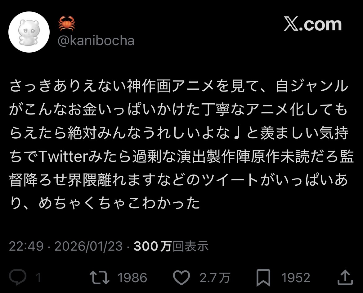 | … | 8226/01/24(土)20:33:06No.1395510867そうだねx1>本当に好きな作品の話はSNSでしないほうがいい |