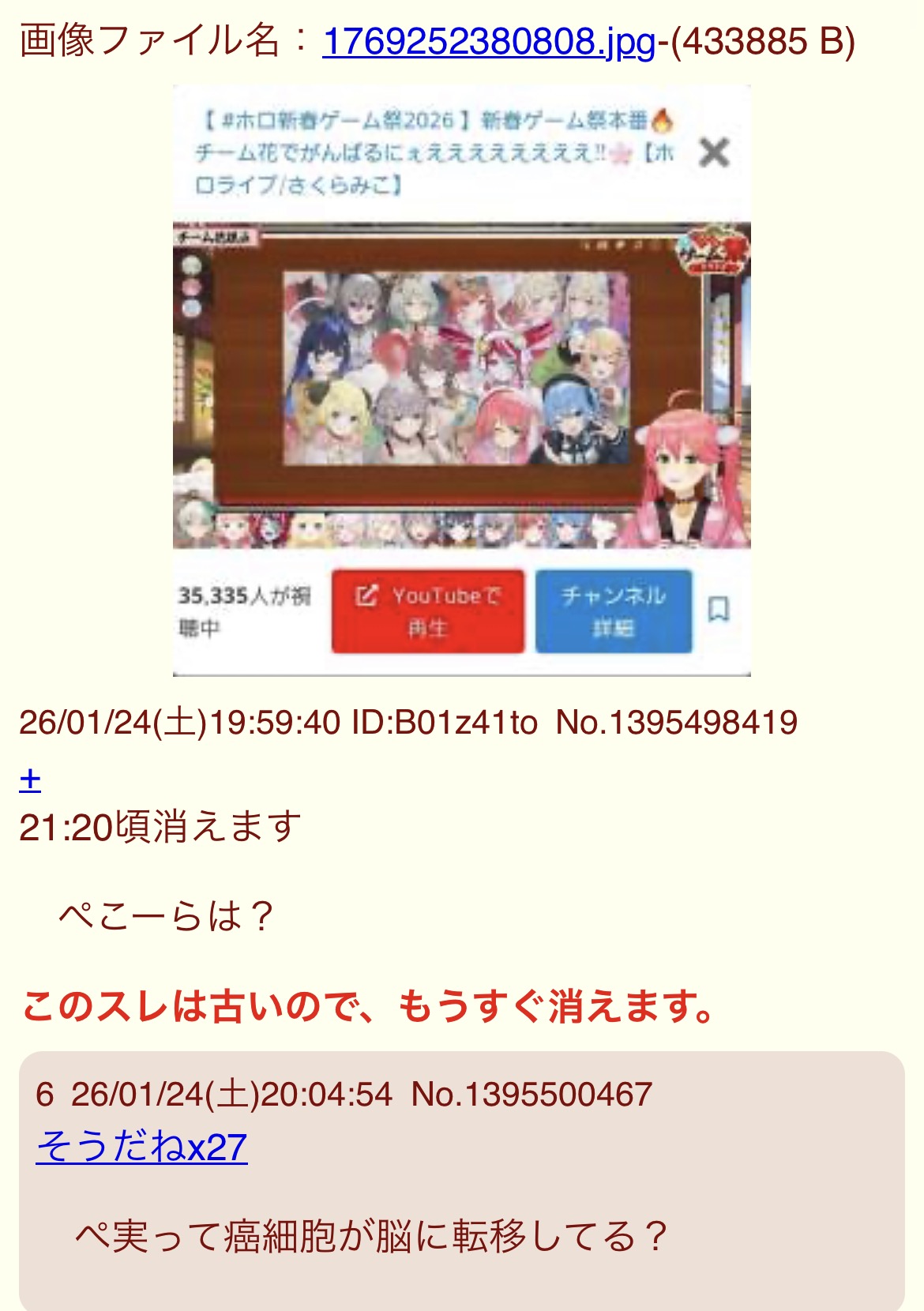 | … | 79026/01/24(土)22:52:47No.1395567072そうだねx8医療関係者(高学歴)でさくらみこファンなんてお兄さんぶちギレてるだろうな |