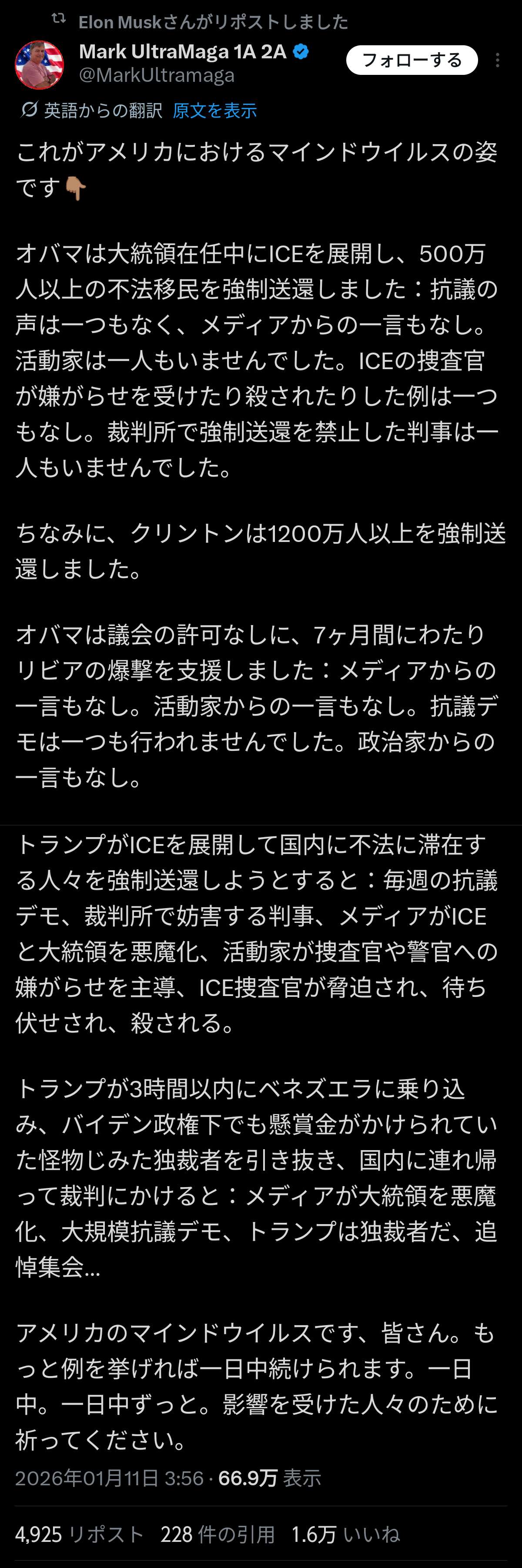 | … | 25726/01/25(日)12:44:39No.1395715769そうだねx3移民が人じゃないなら米国民ほとんど人間じゃなくなるでしょ |
