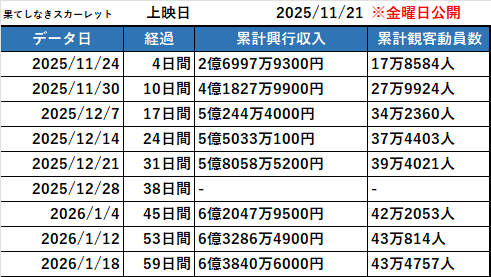 | … | 4026/01/25(日)12:19:17No.1395708967+実写BLEACHも329スクリーンでW杯中狂ったようにCM流してた割に初週の土日2日で1.3億(果てスカは3日で2.1億)だから |