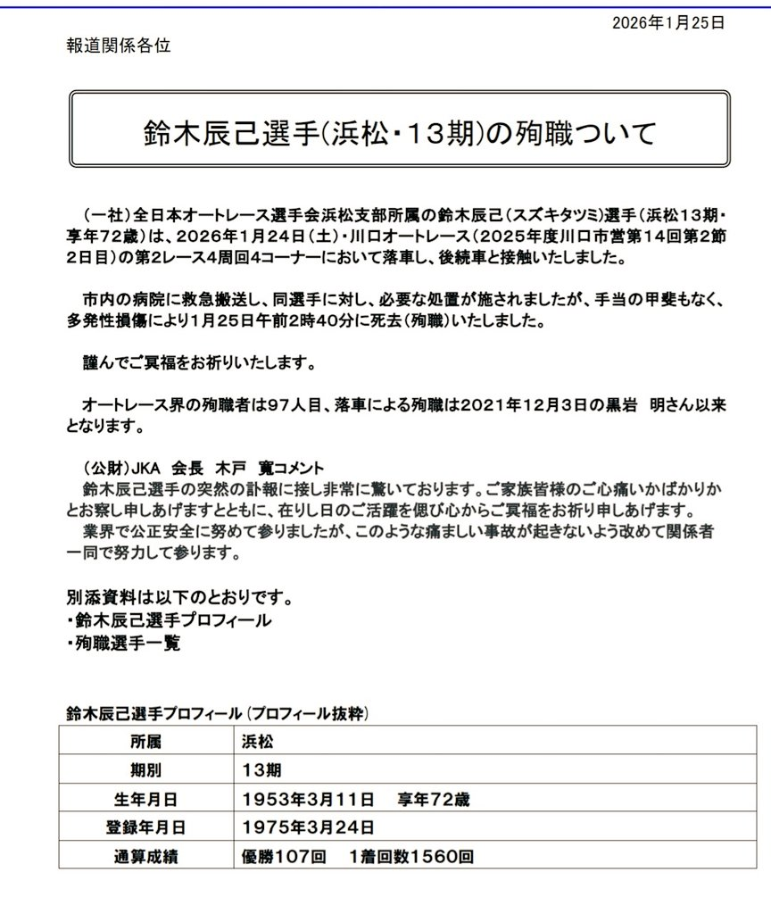 | … | 3026/01/25(日)21:52:41No.1395887129+ボートのほうが死にやすいのかと思ってたけどレースもたいがいなんだな |