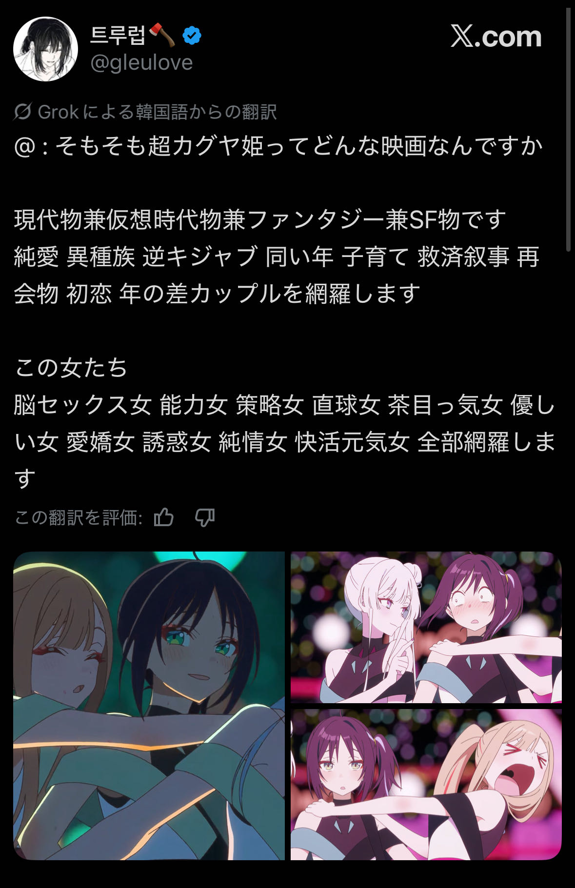| … | 5826/01/25(日)23:44:03No.1395927442+そもそもかぐやは宇宙の電子生命体で人としての身体がたまたま女の子だっただけだからセーフ |