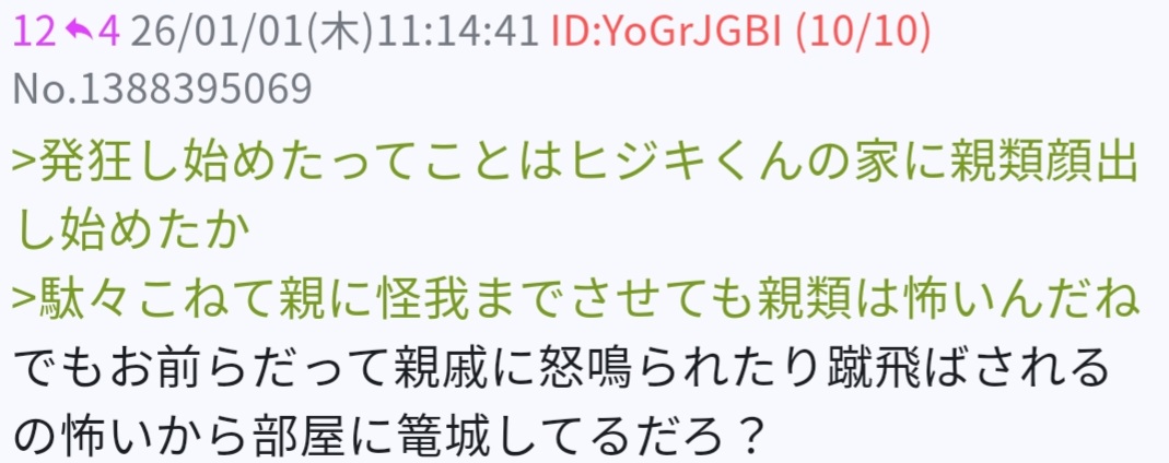 | … | 2526/01/26(月)00:09:12No.1395935739そうだねx9>親戚にまたボコボコにされますように |