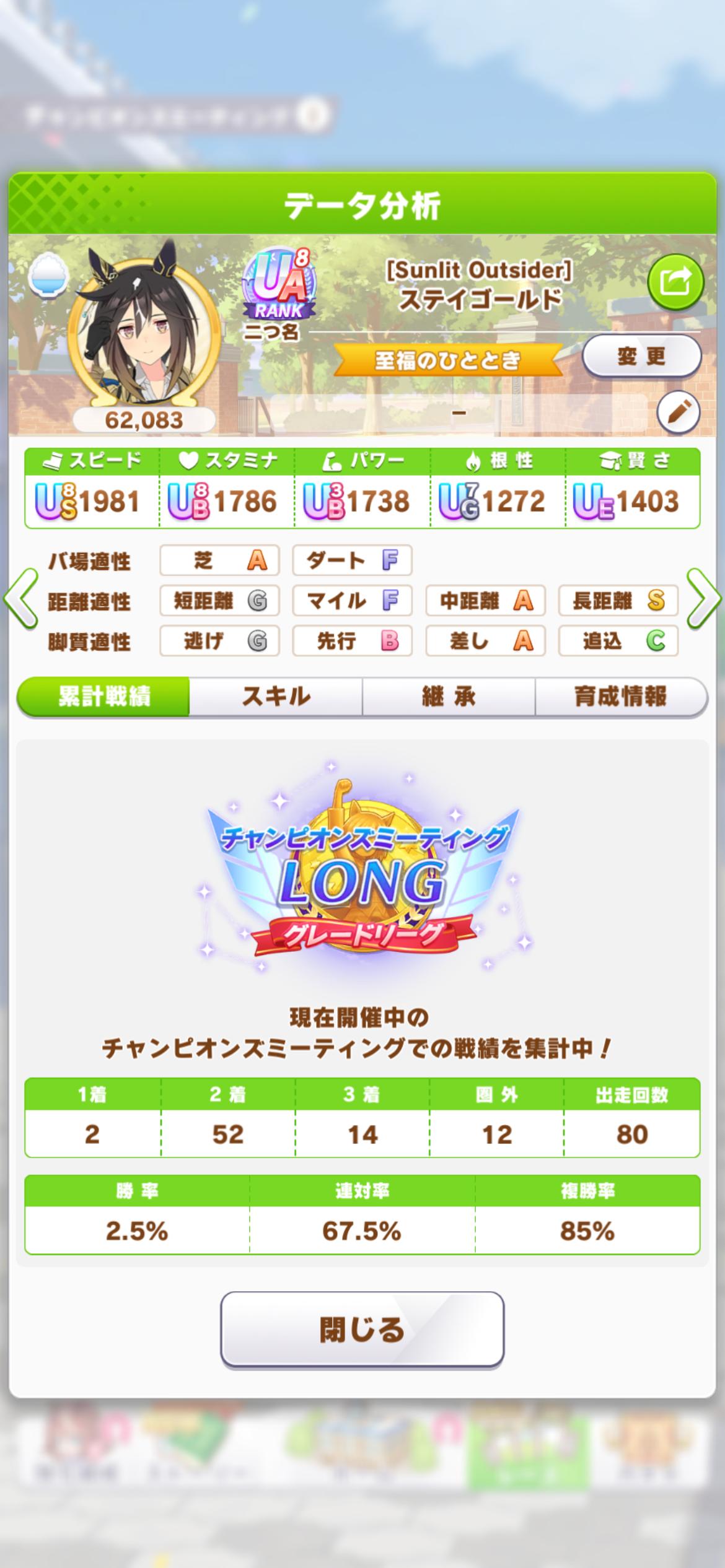 | … | 13626/01/26(月)01:24:43No.1395954320+距離先行Sでステも盛れたし真髄や継承固有もそこそこだけど殿下だけ完走しなかったオグリができたのだ |