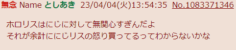 | … | 2426/01/26(月)11:12:51 ID:z..06MacNo.1396004478そうだねx8あとホロリスにはあるポジティブな活動の予測変換がにじリスには一切なくて |