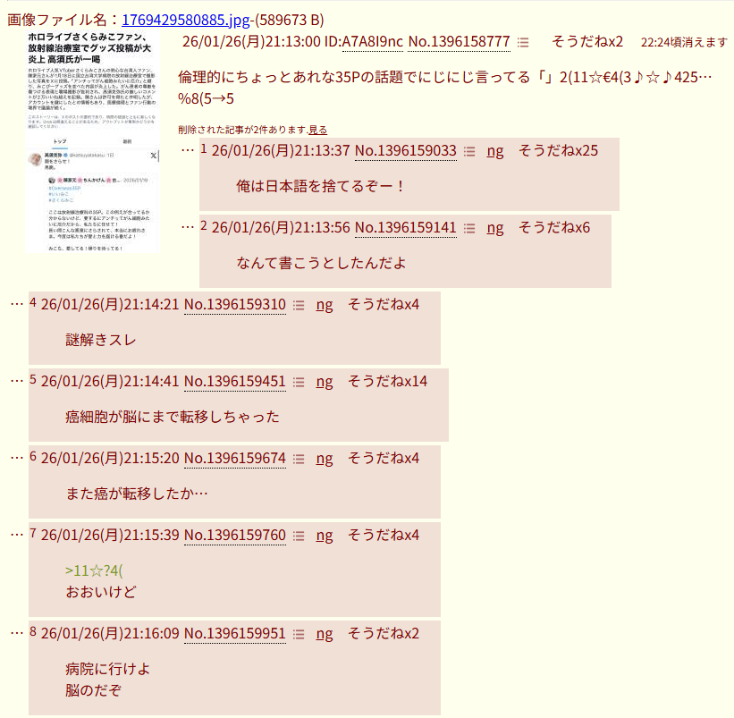 | … | 626/01/26(月)21:45:44No.1396172187そうだねx8ムキになる癌細胞おもれーな(笑) |