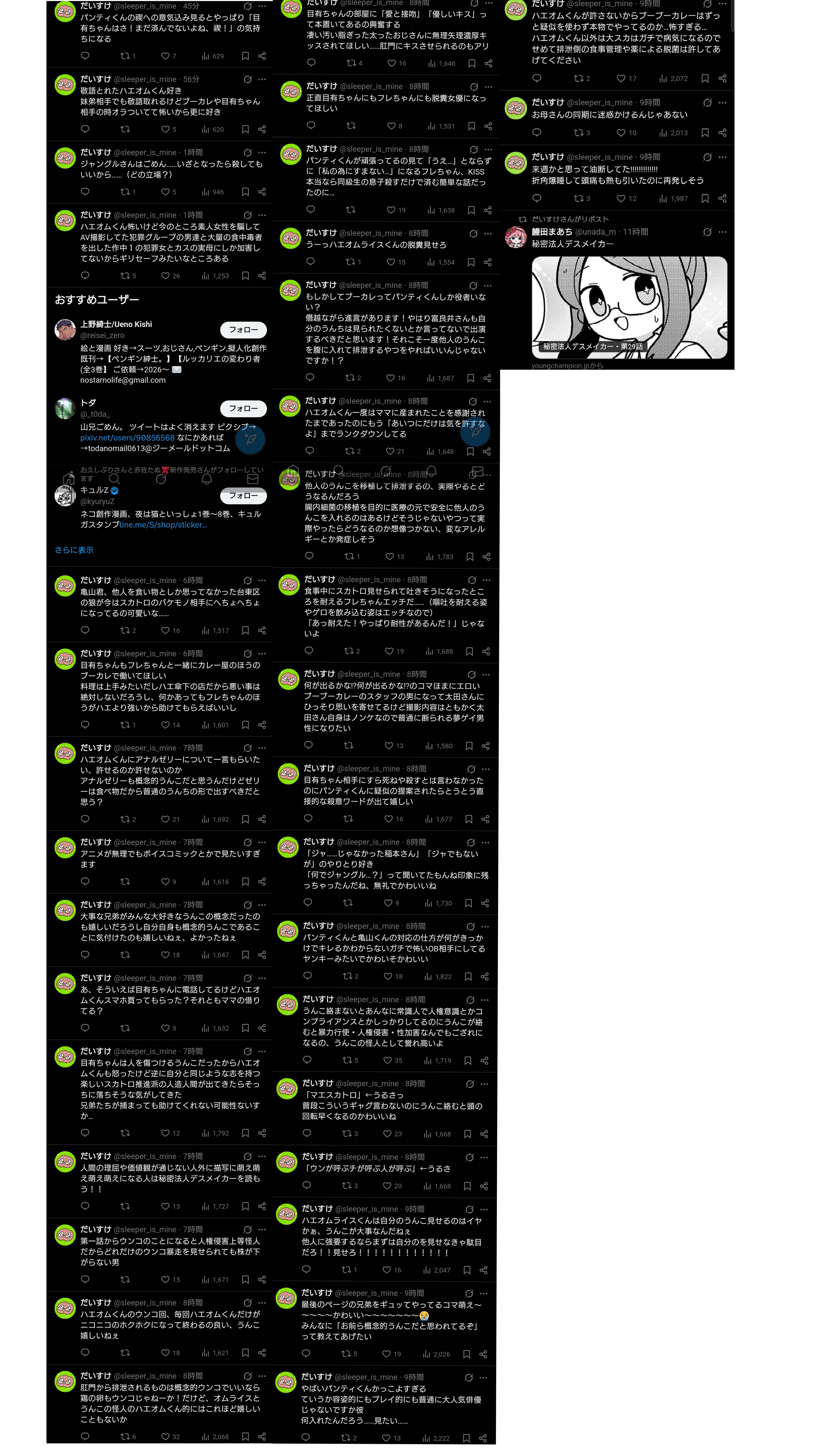 | … | 1426/01/26(月)22:41:36No.1396195430そうだねx4自分のウンコを相手に食わせることに興奮しそうだから実は相性いいんじゃないか? |